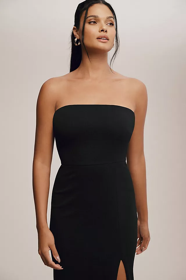 An elegant yet flirtatious style, the BHLDN Adalynn Strapless Stretch Crepe Maxi Gown carves a sleek silhouette with its column shape, open neckline, and high side slit.