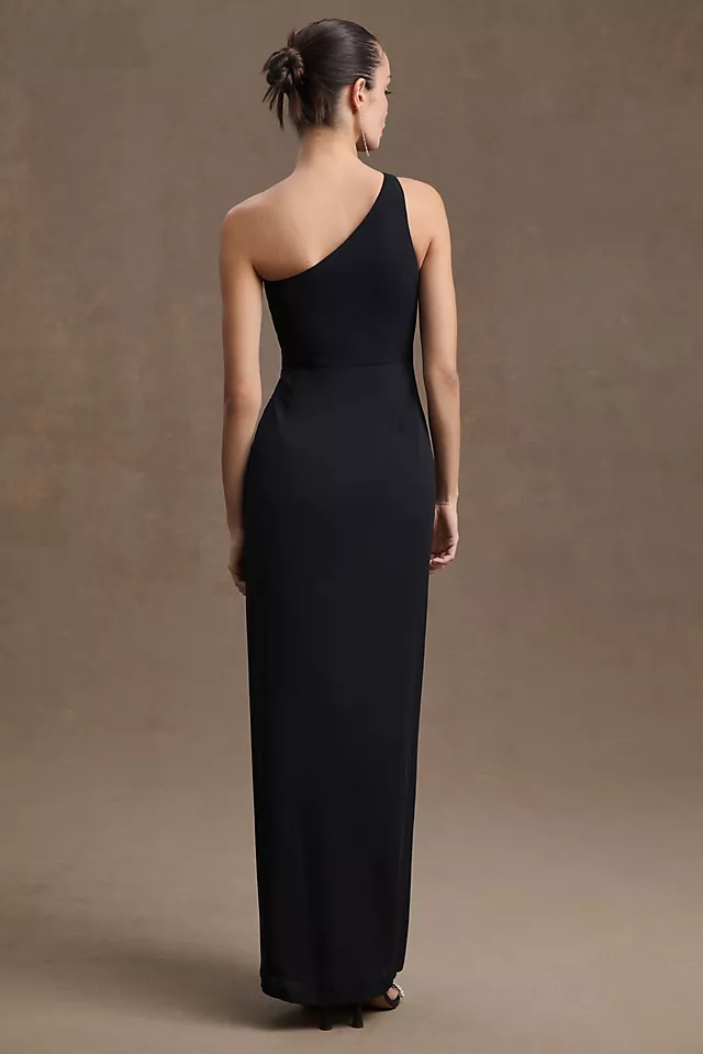 Accented by a wrapped waist, stunning one-shoulder silhouette, and daring front slit, the Chloe One-Shoulder Side-Slit Georgette Gown makes a gorgeous piece for bridesmaids and wedding guests alike.