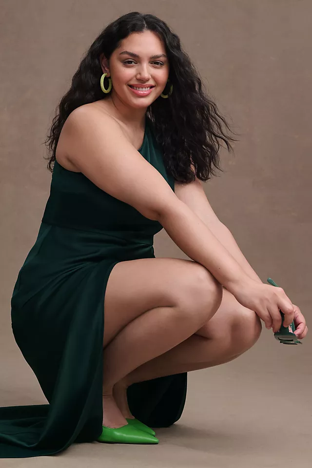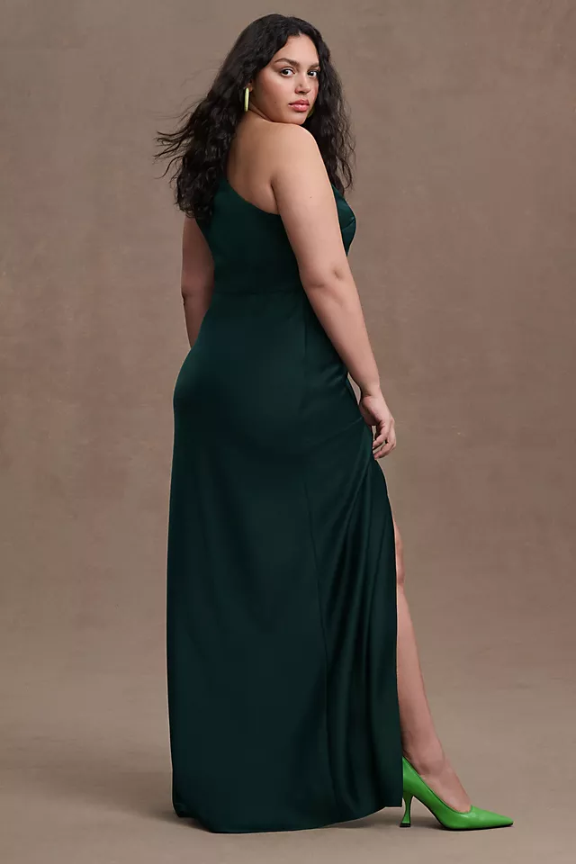A glamorous one-shoulder neckline tops off this sleek maxi dress in luxurious satin charmeuse.