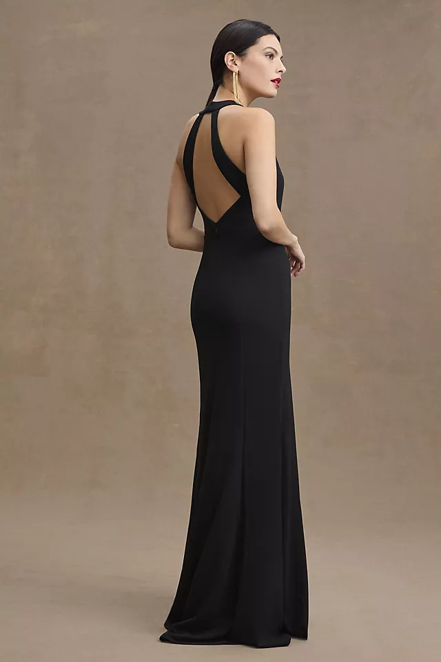 A high-neck silhouette lends a timeless touch to the BHLDN Lennox Halter Open-Back Crepe Gown, while the side slit detail guarantees a flirty finish.