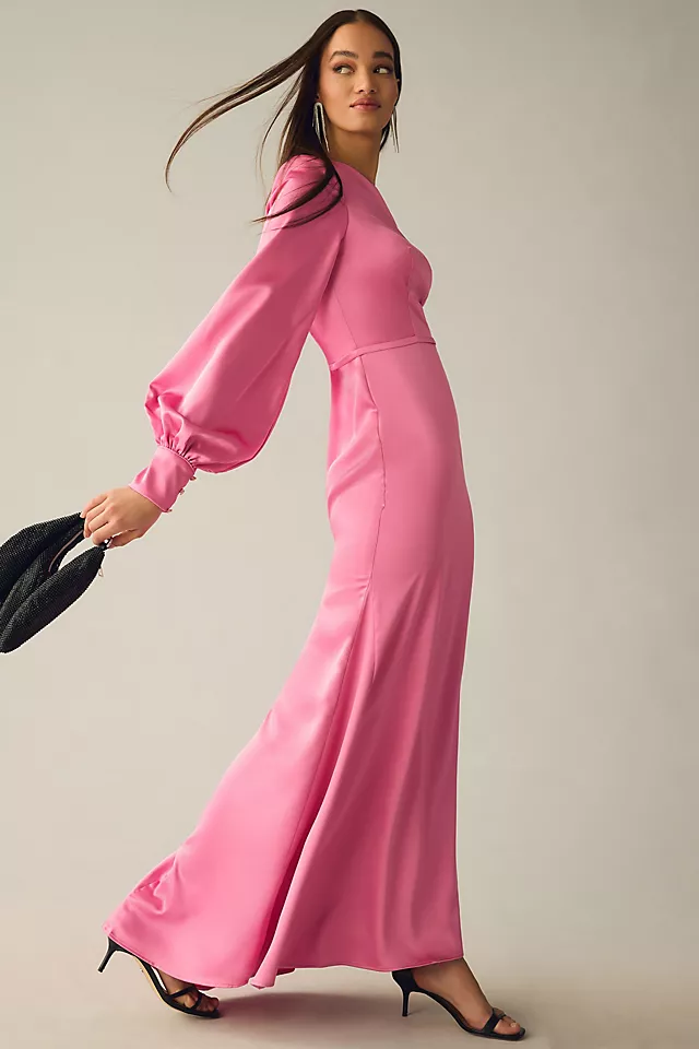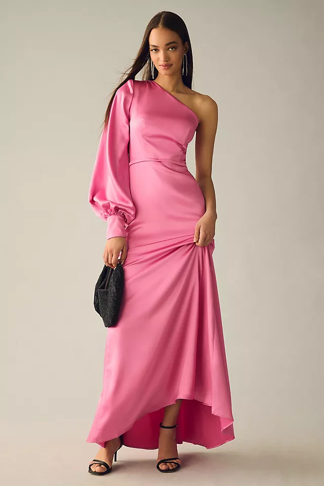 Crafted of a soft satin, this gown boasts a single long bishop sleeve, maxi trumpet silhouette, and sweep train for a pretty and polished look.