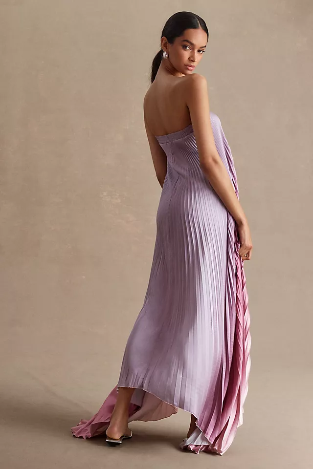The perfect balance of drama and simplicity, the L’IDÉE Elle Gown offers a simple maxi silhouette with pleated crepe fabric, a straight neckline, and an asymmetrical hem for understated elegance.