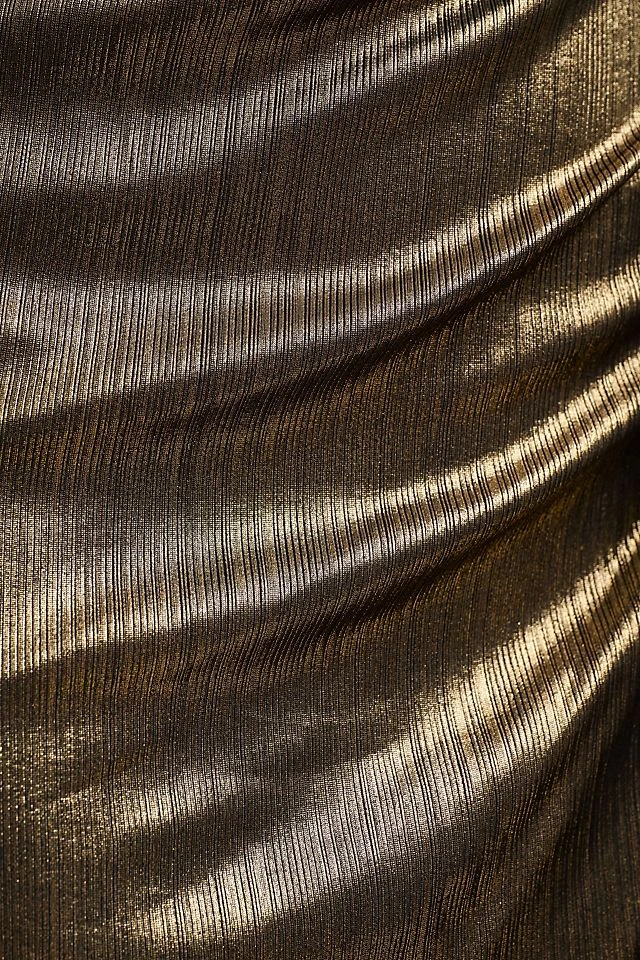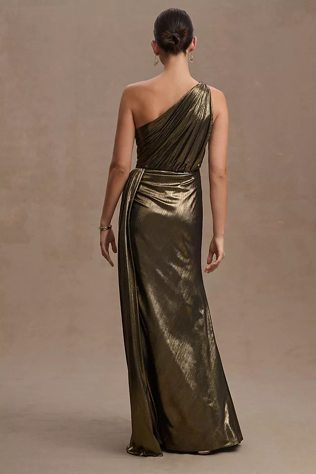 Rendered in a metallic finish, the Mac Duggal One-Shoulder Column Gown flaunts a daring side slit and draped bodice.
