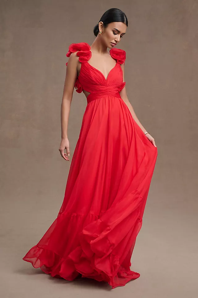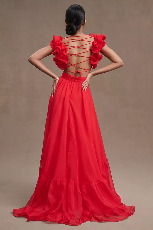 Lush ruffles at the shoulder and hem add romantic detail to the floaty Mac Duggal Indy A-Line Chiffon Gown. A lace-up open back makes an unexpected and sultry finishing flourish.