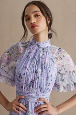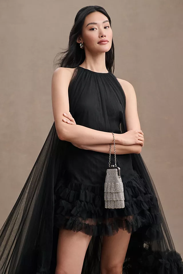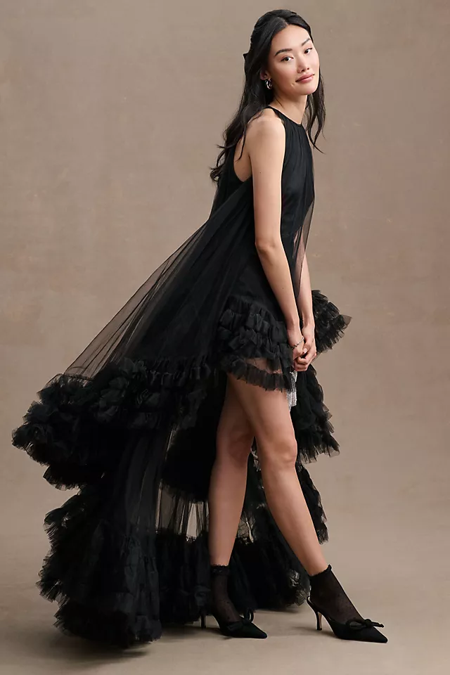 You’re sure to be the center of attention in the show-stopping Mac Duggal Juliana High-Low Tulle Tent Gown, featuring a sleek high neck, clouds of ruffles, and a back that effortlessly cascades across the dance floor.