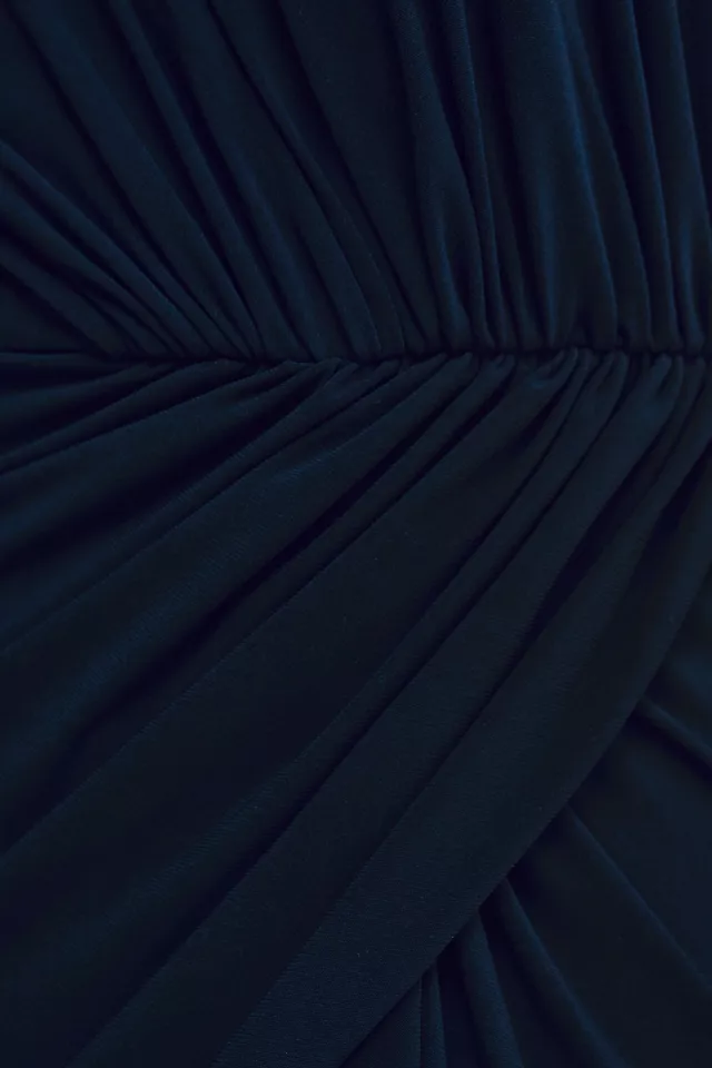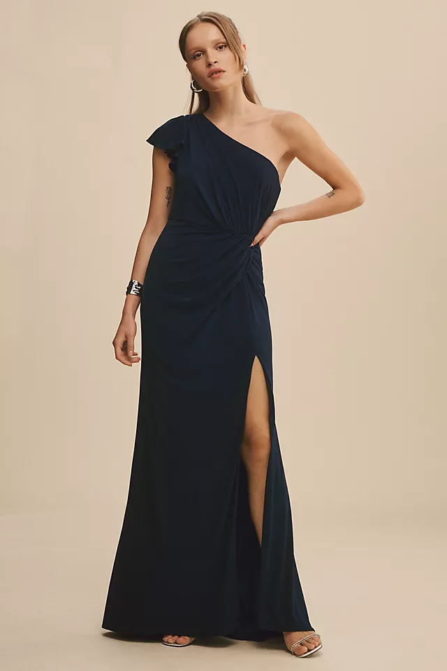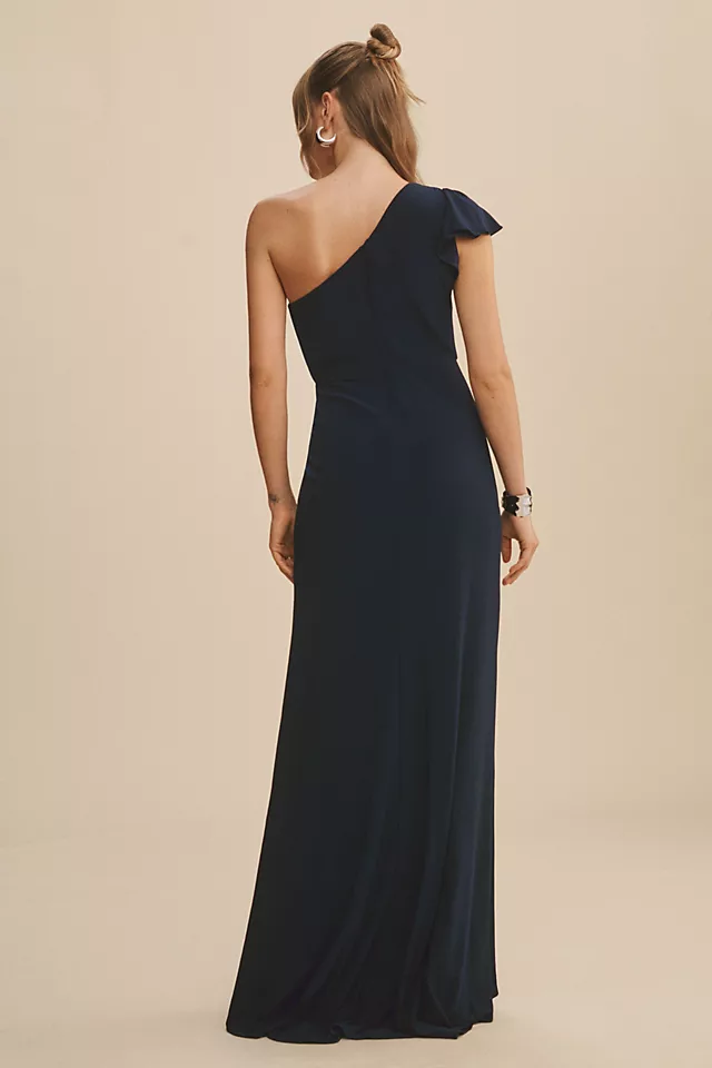 Rendered in jersey so you can dance all night long, the Mac Duggal One-Shoulder Column Gown flaunts an asymmetric neckline, single ruffled cap sleeve, draped bodice, and daring side slit.