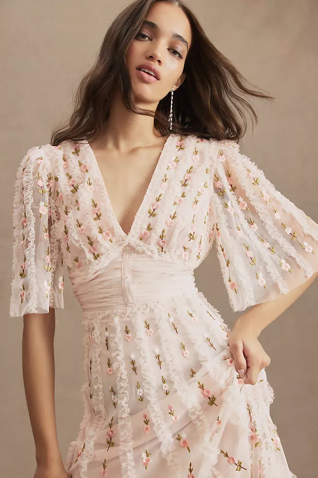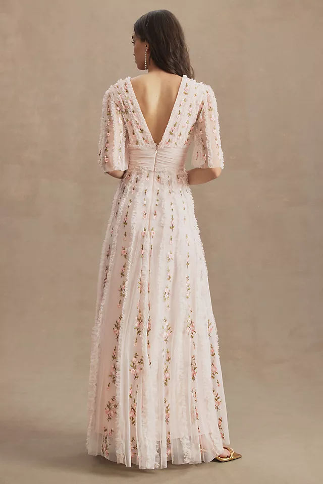 Delicate floral embroidery and charming ruffles add whimsy and wonder to the Mac Duggal Ruffled V-Neck Gown. With a pleated faux-placket waist and sheer, short bell sleeves, this enchanting silhouette makes a sweet statement at any warm-weather occasion.