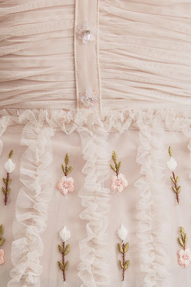 - Mesh overlay fabric with allover floral embroidery and ruffles