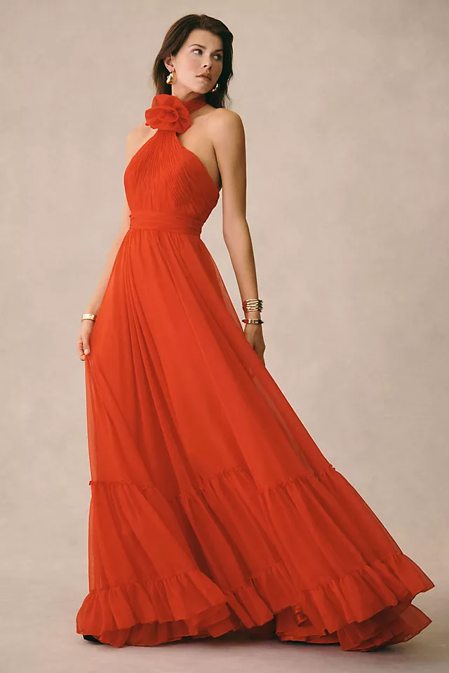 The Mac Duggal Halter A-Line gown makes an opulent edition to any wedding party or rehearsal. The maxi A-line silhouette is accented with an open back, organza floral neck detail, and an airy tiered skirt.