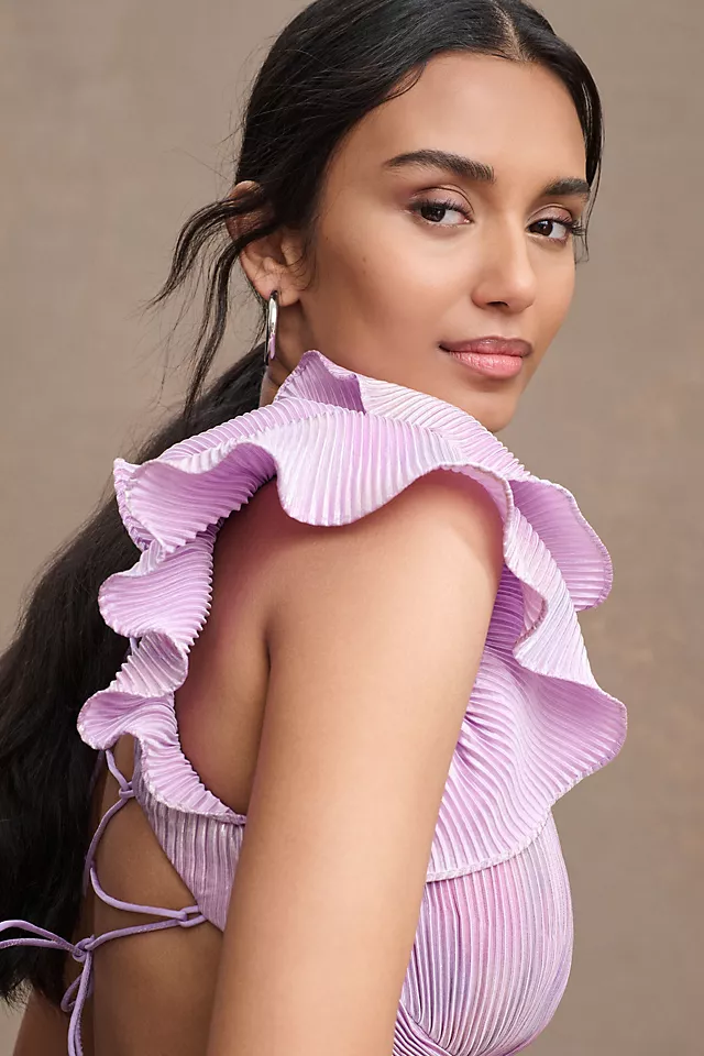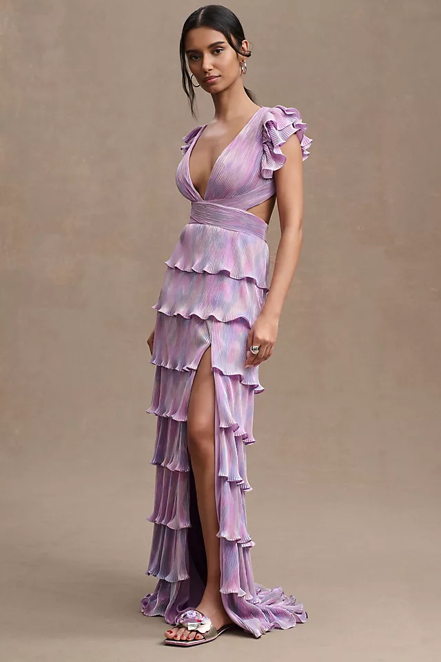 A vision in a maxi column silhouette with a sky-high slit, the Mac Duggal Tiered Plissé Lace-Up Gown stuns with flutter sleeves, a plunging v-neckline, side cutouts, lace-up back details, and a tiered skirt – all in the name of elegance.