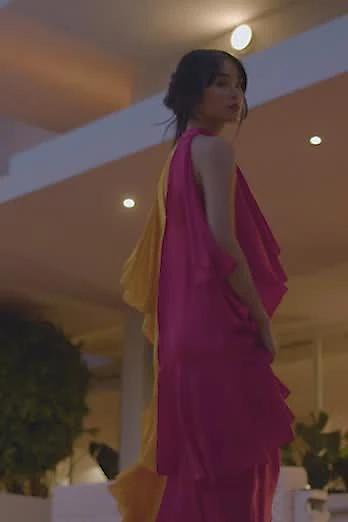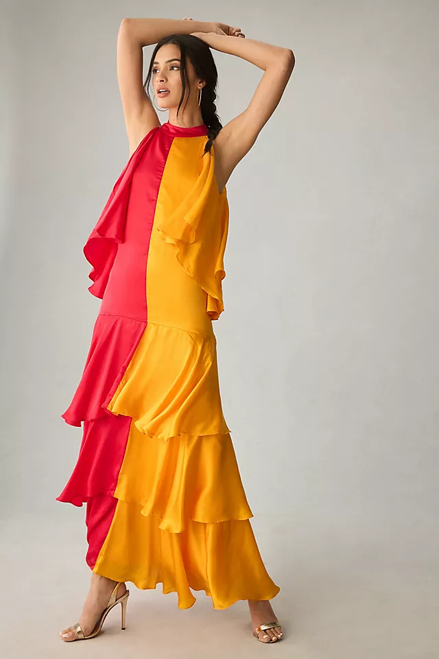 Mac Duggal Ruffled Cross-Back Smock-Waist Floral Embroidered Gown