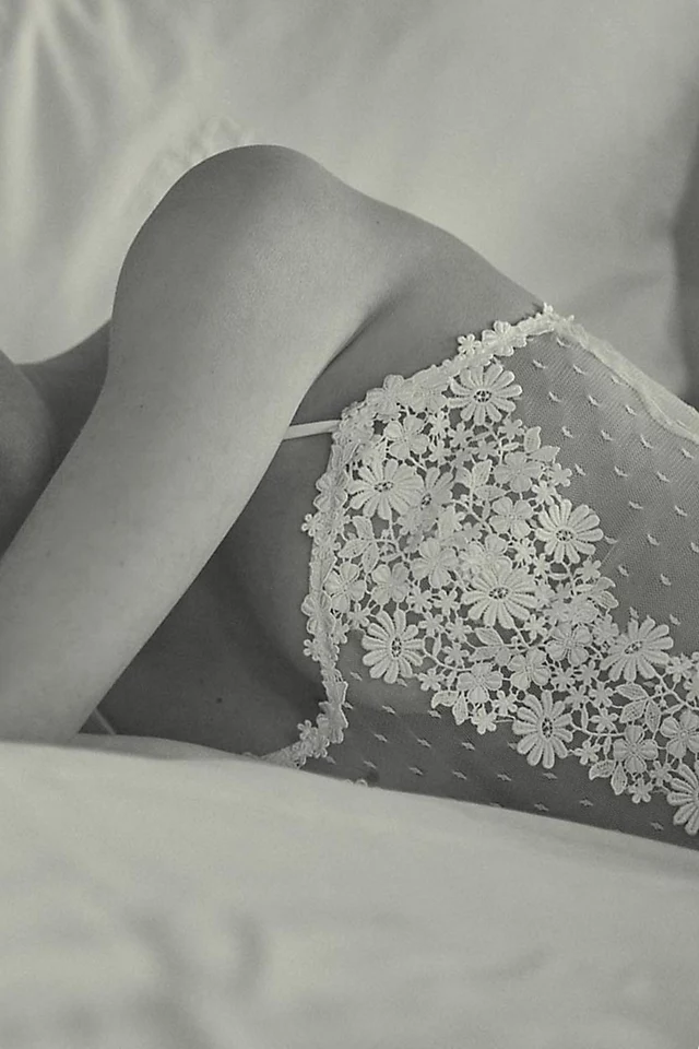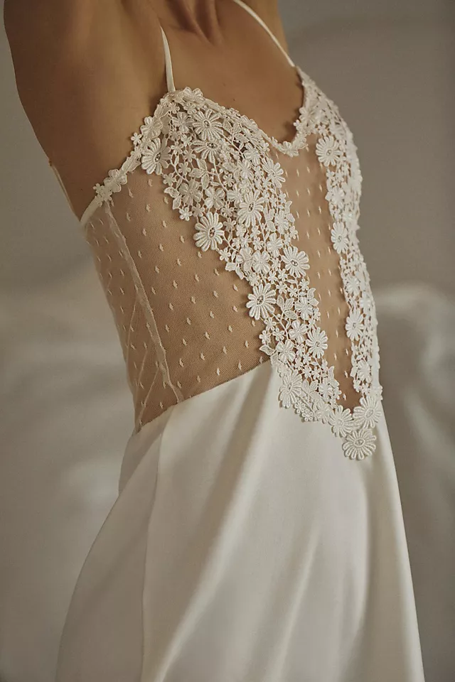 Exquisite floral applique and sheer Swiss Dot tulle; a delicate combination.