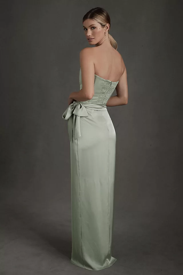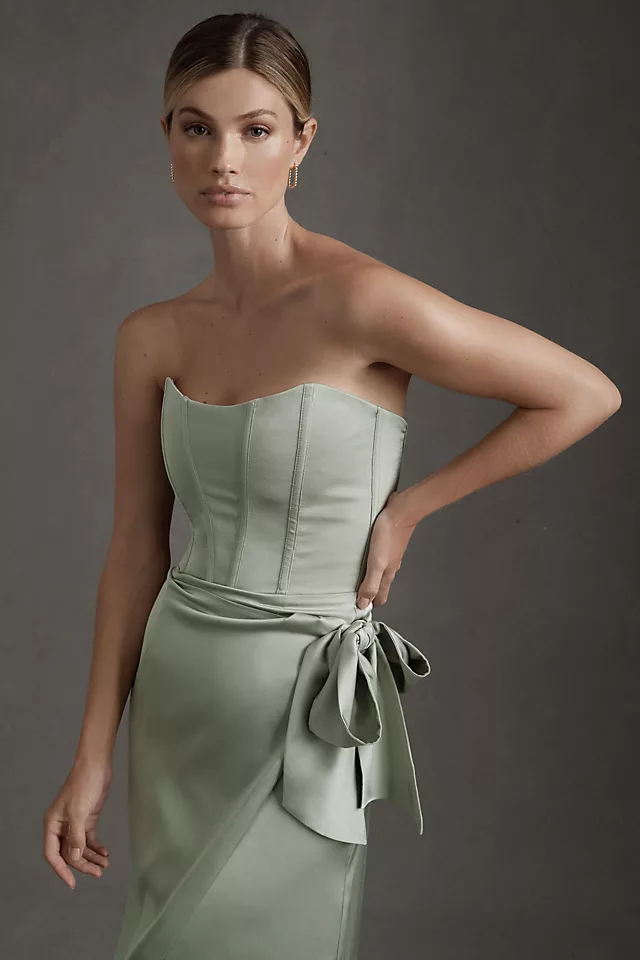 Meet the June sheath gown by V. Chapman, a romantic vision of femininity. Bustier styling, a daring front slit, and a side-tie sash will add elegant flair for a reception dress, for a bridesmaid, or a celebration that will always be remembered.