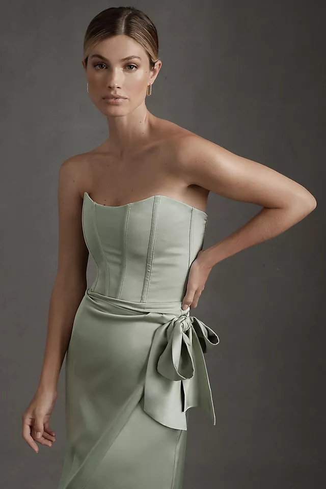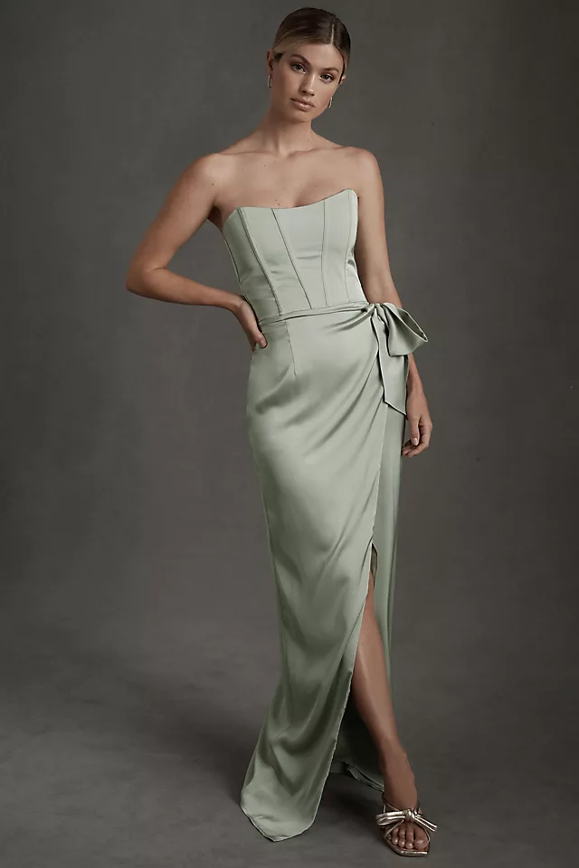 With an of-the-moment corset top and a semi-satin wrap skirt that falls gracefully from the waist, the June also features a side slit and soft bow detail.